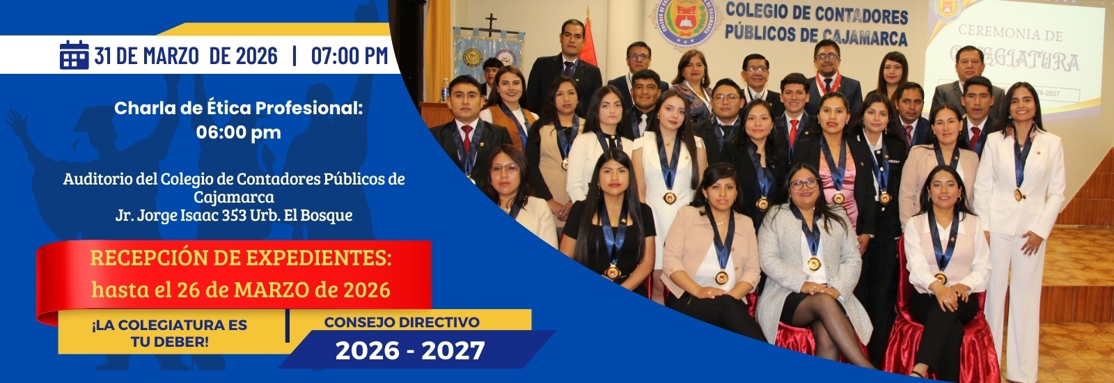 03 Marzo 2026El Colegio de Contadores Públicos de Cajamarca tiene el agrado de informar que se llevó a cabo una Colegiatura Extraordinaria, incorporando oficialmente a un nuevo miembro a nuestra orden profesional.